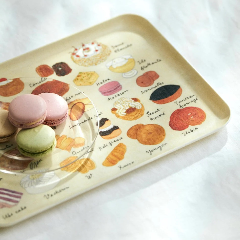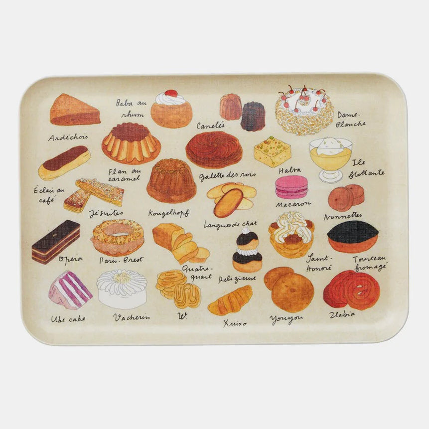 Useful, light-weight serving trays made from linen that has been covered in a poly resin. This colorful pastry-themed tray features original illustrations by Isabelle Boinot.