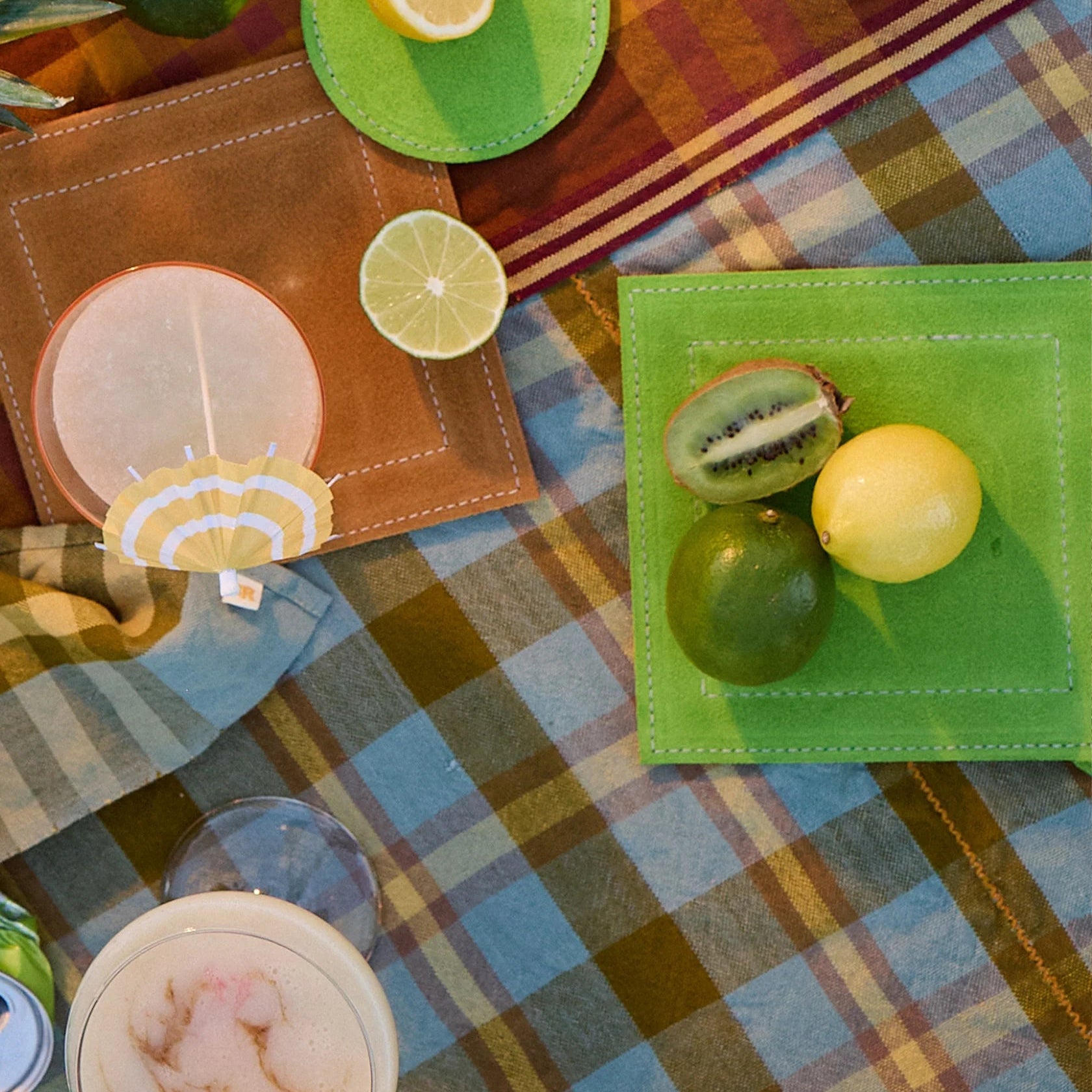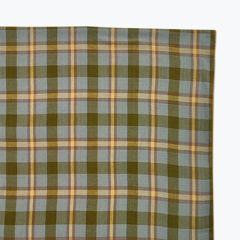 Square plaid tablecloth in brown and blues.