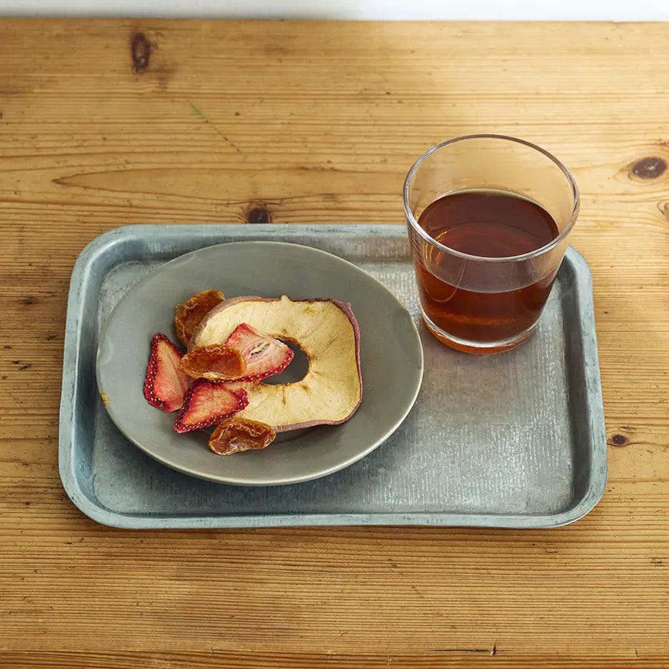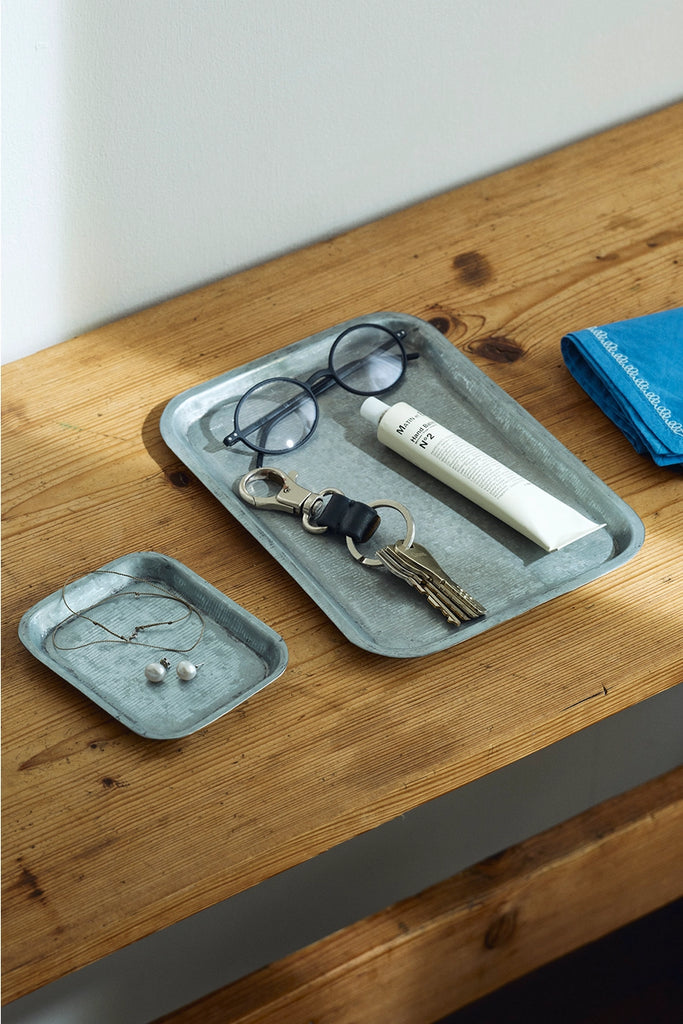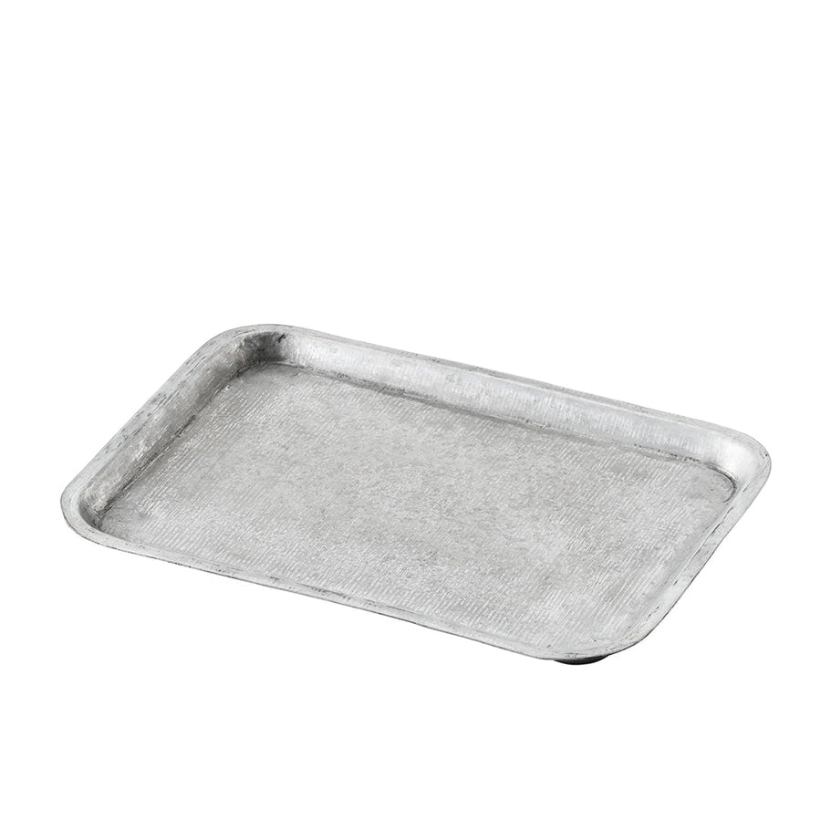 A simple tray made of tin, featuring an industrial, minimalist charm. Perfect for holding a cup and saucer with a snack during your coffee break, or for organizing items on your dresser or side table.