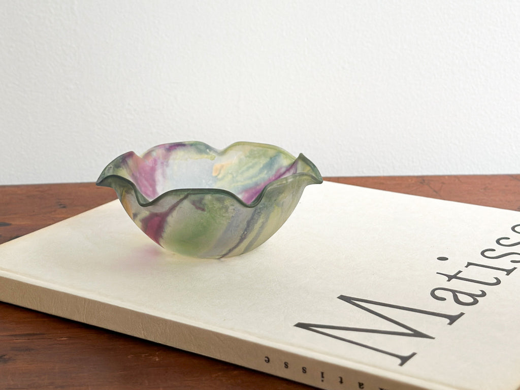 Petite colorful frosted glass bowl with ruffled rim.